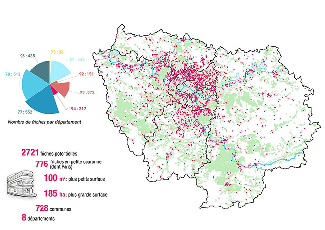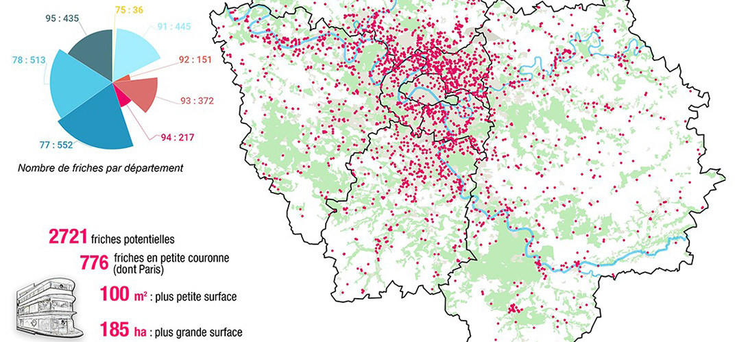 2.721. C’est le nombre de friches potentielles qui ont été recensées en Île-de-France par le nouvel observatoire dédié de l’Institut Paris Region. Dans le détail, les sites identifiés totalisent 4 200 hectares, le plus petit développant 100 mètres carrés et le plus grand 185 hectares, et sont répartis sur 728 communes. Leurs natures sont hétérogènes (agriculture, habitat, infrastructures, activités, carrières, loisirs…), tout comme leurs propriétaires : 1 990 sont des acteurs privés, 706 publics et 25 public/privé.